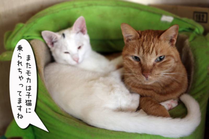 モカはだいたい子猫に乗られています。乗っても怒らないし何よりも暖かいし毛繕い付きですから。