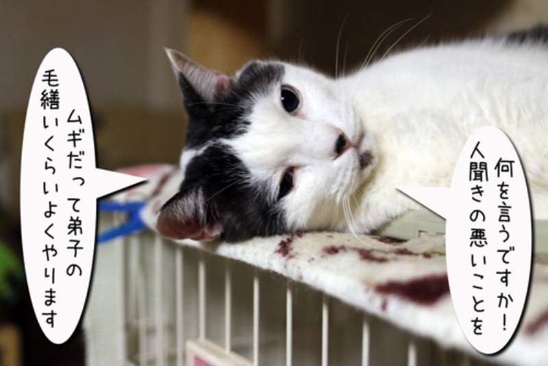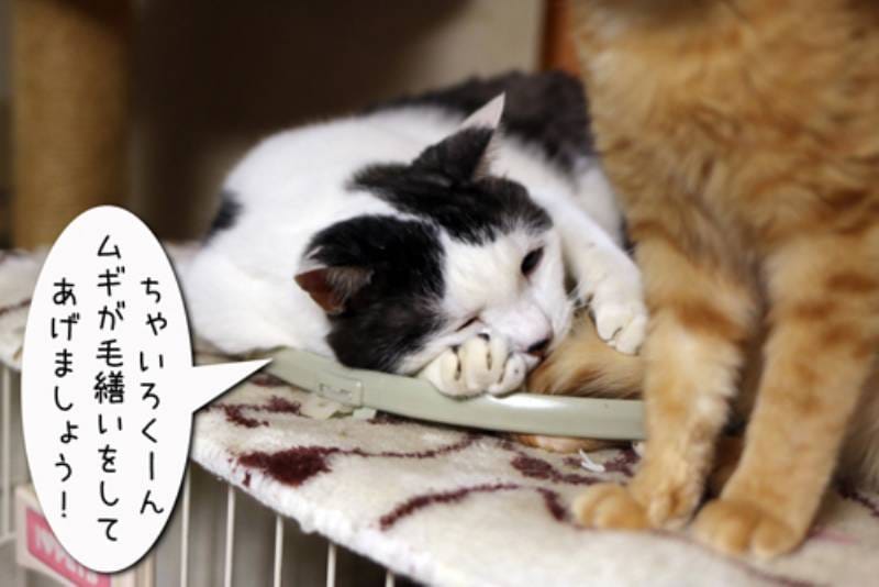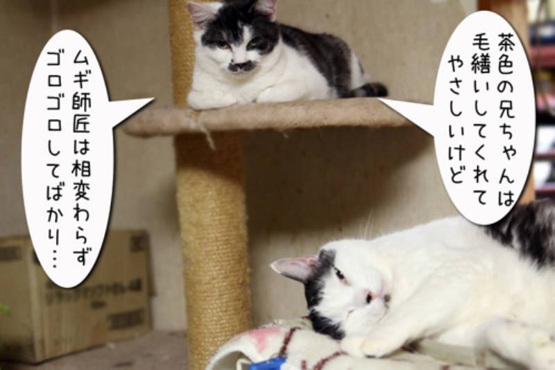 モカがお母さんのような存在ならばムギはどうでしょうか? 白黒ちゃんが観察していると…いつもゴロゴロしています。 それを聞いたムギは、ムギだって毛繕い位出来ます!と張り切るのですが… 茶色のシマシマを見たムギはつい尻尾をガジガジ。 でもムギの周りも子猫でいっぱい。ご飯は盗むし毛繕いも毛並みの逆にするムギですが、どうやら子猫には好かれているようです。