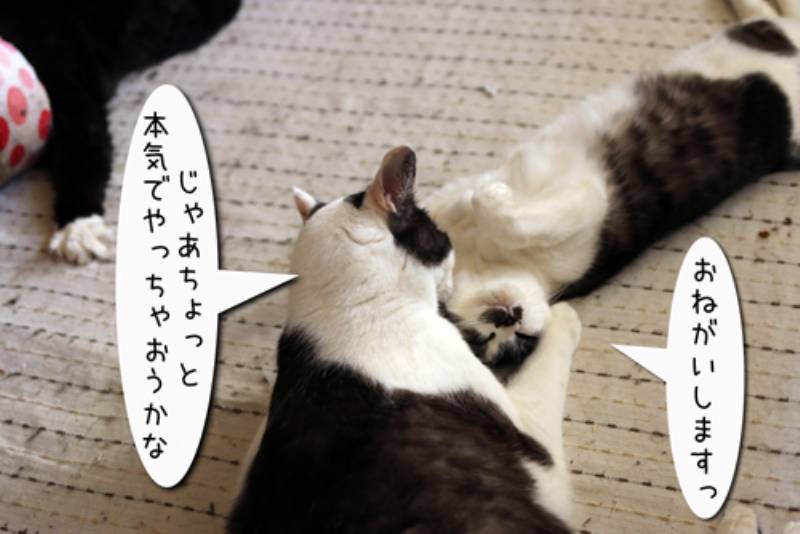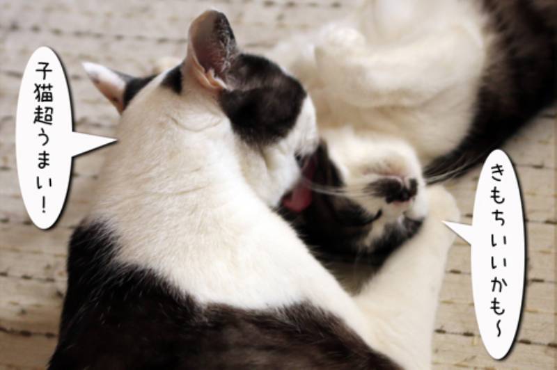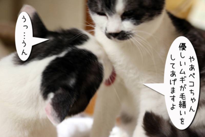 子猫の毛繕いが大好きなムギさん。今日も白黒さんに毛繕いをしようとしています。 まんざらでもない白黒さんでしたがそろそろ眠りに行きたい。 しかしそう簡単には終わりそうにありません。あの巨体に乗られるともう動けません。 その現場を目の当たりにした白さんはそっと息を殺してその場を離れるのでした。 ちょっとあの毛繕いはお断りです。