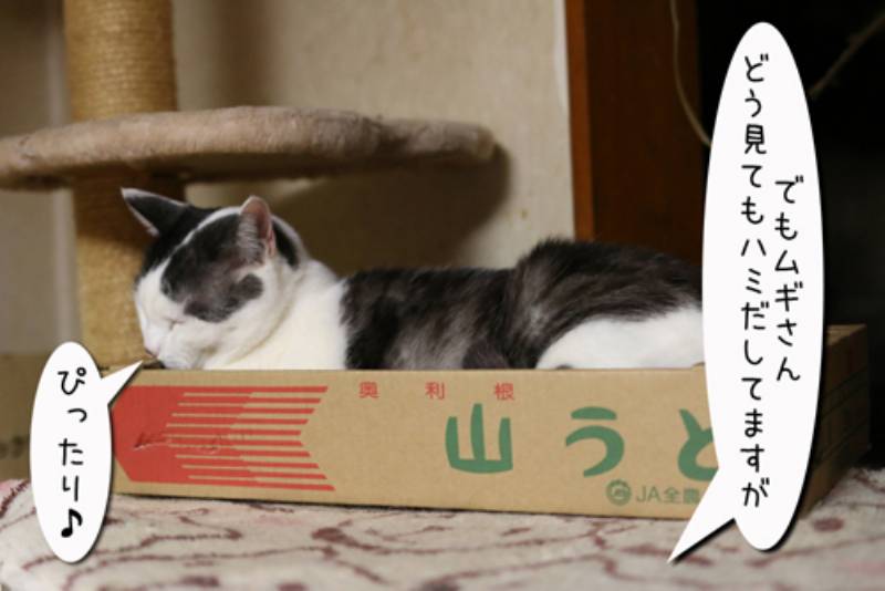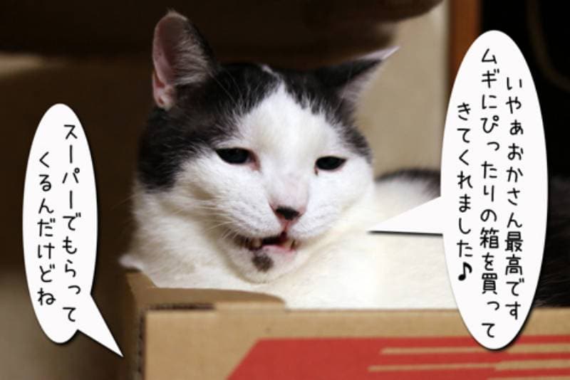 箱をもらったムギさん。とてもご機嫌です。 そこに通りかかったちびちゃん。さっそくその箱に入る事を勧めるムギでしたが、どうやら一緒に入ろうということらしい。 当然ムギでパンパンの箱に入れるわけはなくハミだしちゃっています。 しかしガシっと掴んで毛繕いをしているムギからは逃げられません。 やはりいつも通りにヒドイめにあってしまう子猫さんでした。