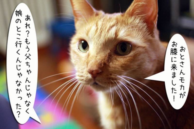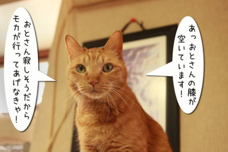 前回イジけて娘のほうに行ってしまったモカでしたが、やっぱりモカの指定席は父ちゃんの膝の上。 今日は誰も乗っていないので急いで膝に乗ります。 しかし、やっぱりぽーちゃんが来ちゃいました。またモカがいじけてしまうので、ぽーちゃんにはあとでブラッシングをすることに。 ぽーちゃんを下におろしたらモカがとってもうれしそうにしていました。
