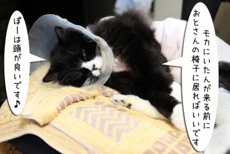 そうだ!モカよりも先に椅子に乗っていればいいんだ!そう思ったぽーちゃん。さっそく椅子に先に乗って父ちゃんを待つことに。