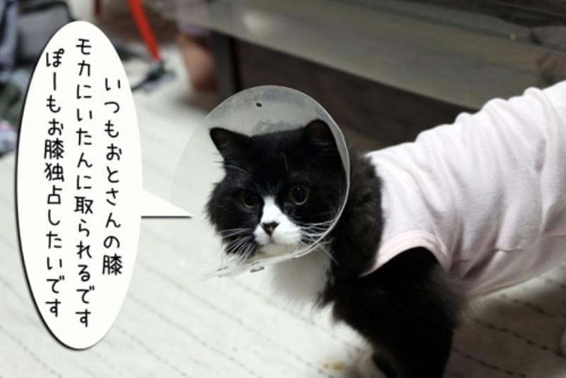 ぽーちゃんが父ちゃんの膝の上に乗ろうとすると、いつもモカが居て、なかなか乗ることができません。