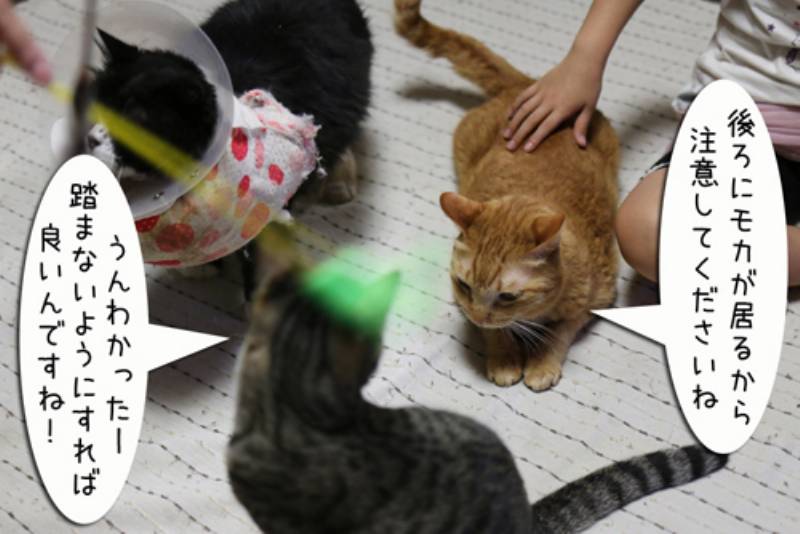 たまらず逃げるモカ。ムギはそんな物にと呆れています。しかしムギも猫。呆れていたわりには一番体が勝手に反応してしまいました。
