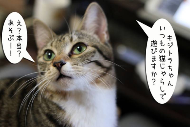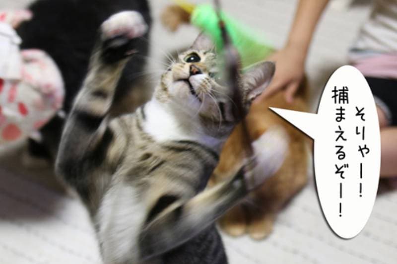 キジトラちゃんと猫ジャラシで遊ぶ事にしました。しかし後ろにはモカ達がくつろいでいます。