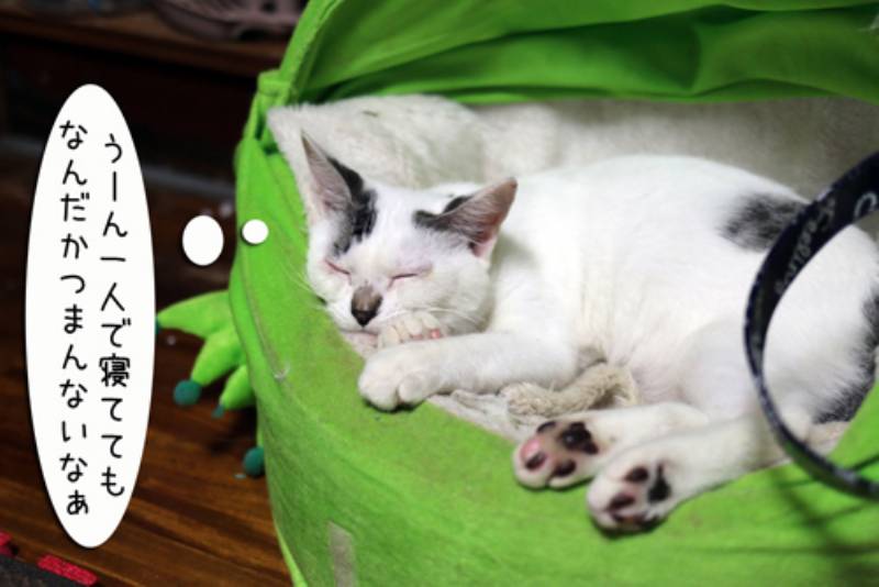 一人で寝てみるけど、なんだか寂しい。ムギを枕にしてみたけど、大きすぎて居心地はよくないし、娘に抱かれると落ち着かないし…