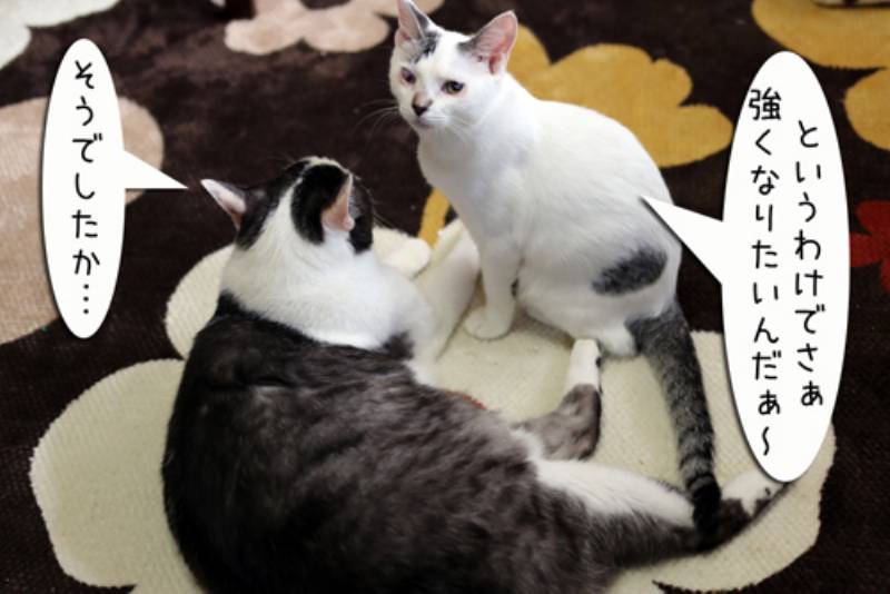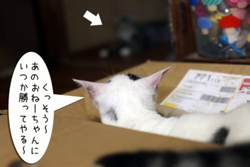 白ちびさんはとてもヤンチャで、すぐに先輩猫に挑みます。まだまだ体が小さいので先輩猫には軽くあしらわれてしまいます。