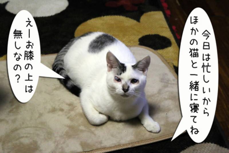 チビブチくんは甘えん坊さんです。いつも誰かと居たい。今日はおじさんの膝の上は断られてしまったので、一緒に寝る相手を探します。シマ猫さんたちは丸まってぽーちゃんはちんまり。
